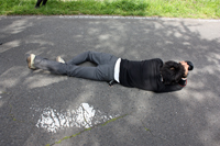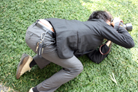 地面に寝転がって、這いつくばって、