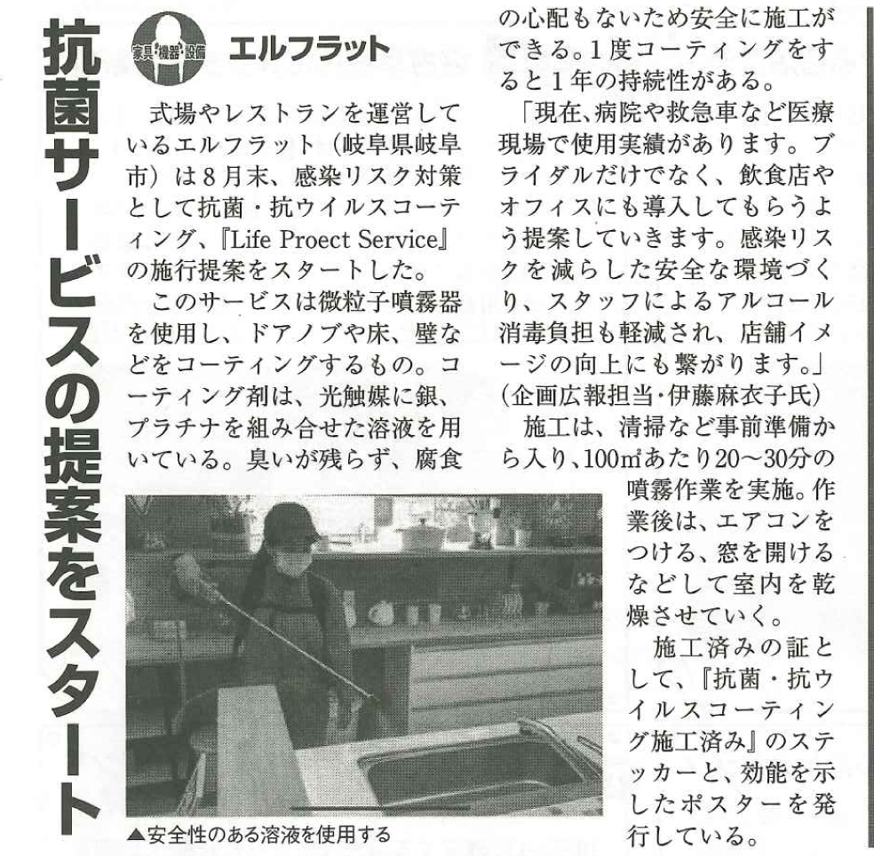 ブライダル産業新聞に弊社サービスに関する記事が掲載されました 2020年09月21日 2020年9月21日号のブライダル産業新聞に新事業「抗菌・抗ウイルスコーティングサービス」について取り上げていただきました。