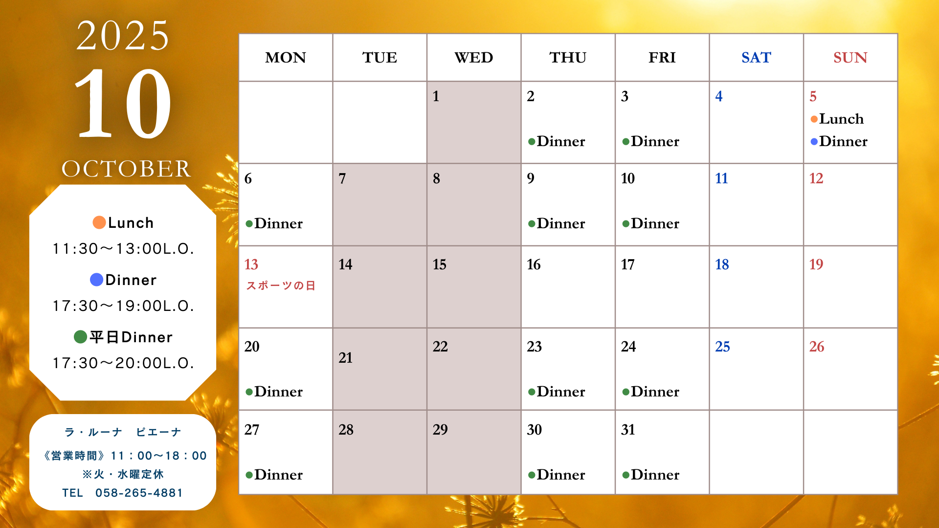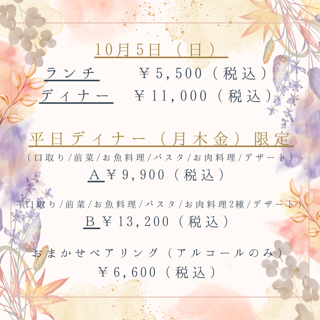 ~10月5日(日)ランチ&ディナー~