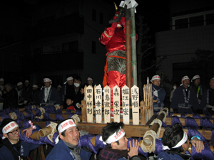 グルグル廻る御輿から赤鬼がジャンプ!