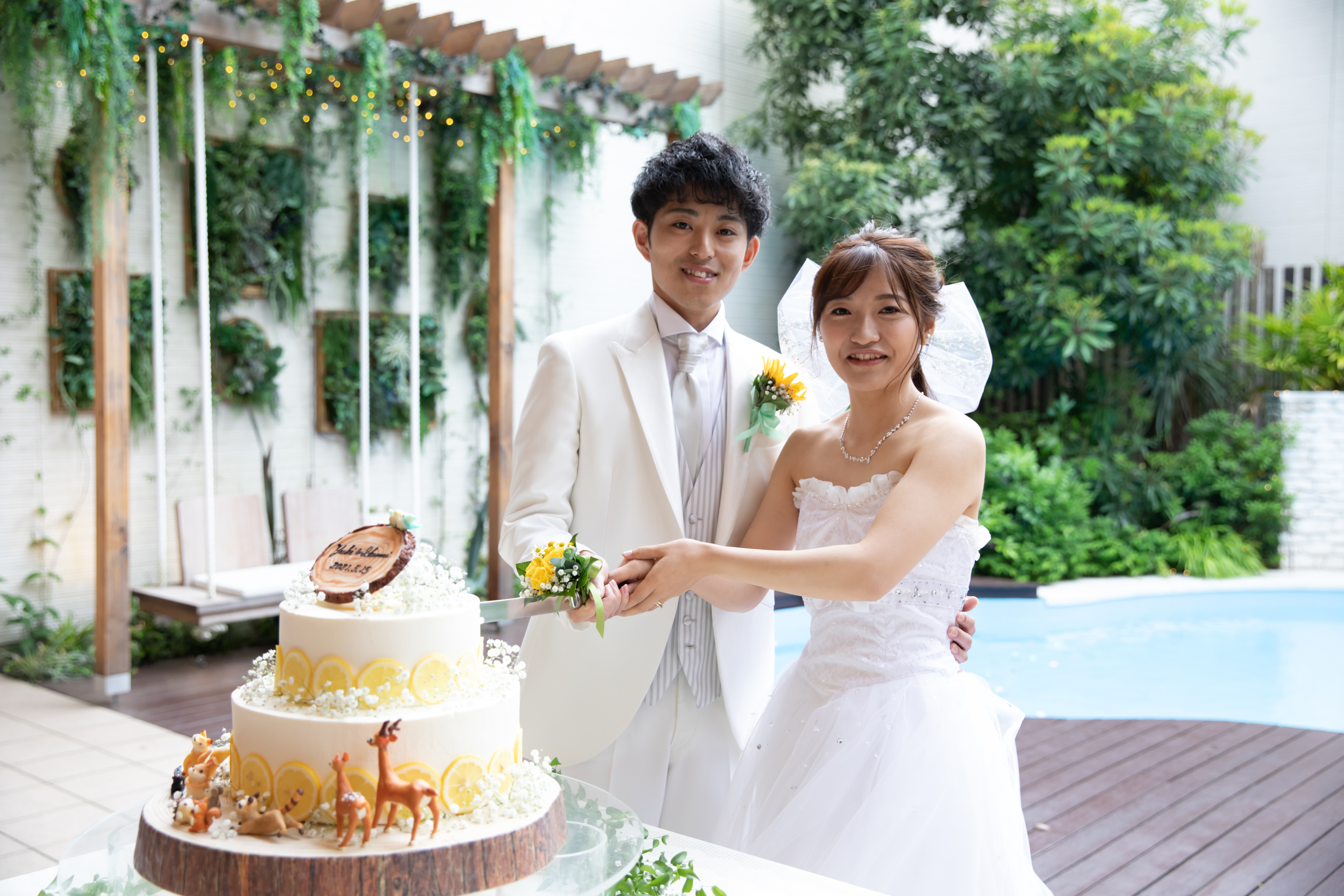 ケーキ入刀シーンでは、お庭で行ったおふたり。後ろのバックも自然が溢れており